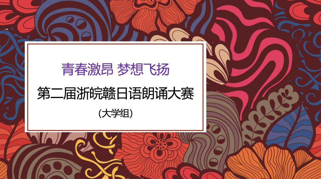 “第二届浙皖赣日语朗诵大赛”由中国日语教学研究会浙皖赣分会主办,杭州师范大学天堂资源最新在线、杭州慧洋教育科技有限公司协办。大赛以“青春激昂,梦想飞扬”为主题,吸引了浙江大学、浙江工商大学、南昌大学、安徽师范大学等浙皖赣地区共36所高校选手参加,选手们采用录播形式投稿参赛。