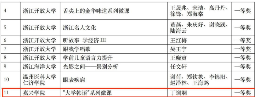 近日,2021年浙江省高校教师教育技术成果评比结果揭晓,我院推荐选送的作品喜获佳绩。其中,丁斓斓老师的作品《“大学韩语”系列微课》荣获一等奖,这是我校此次斩获的唯一一项一等奖;钱征宇、章剑飞、郑晓明、杨桂华、乔艳霞的作品《大商之道—用英语讲浙商故事》和刘韵超、张艳琴、金崎蓝子的作品《零基础开口说日语》荣获二等奖。