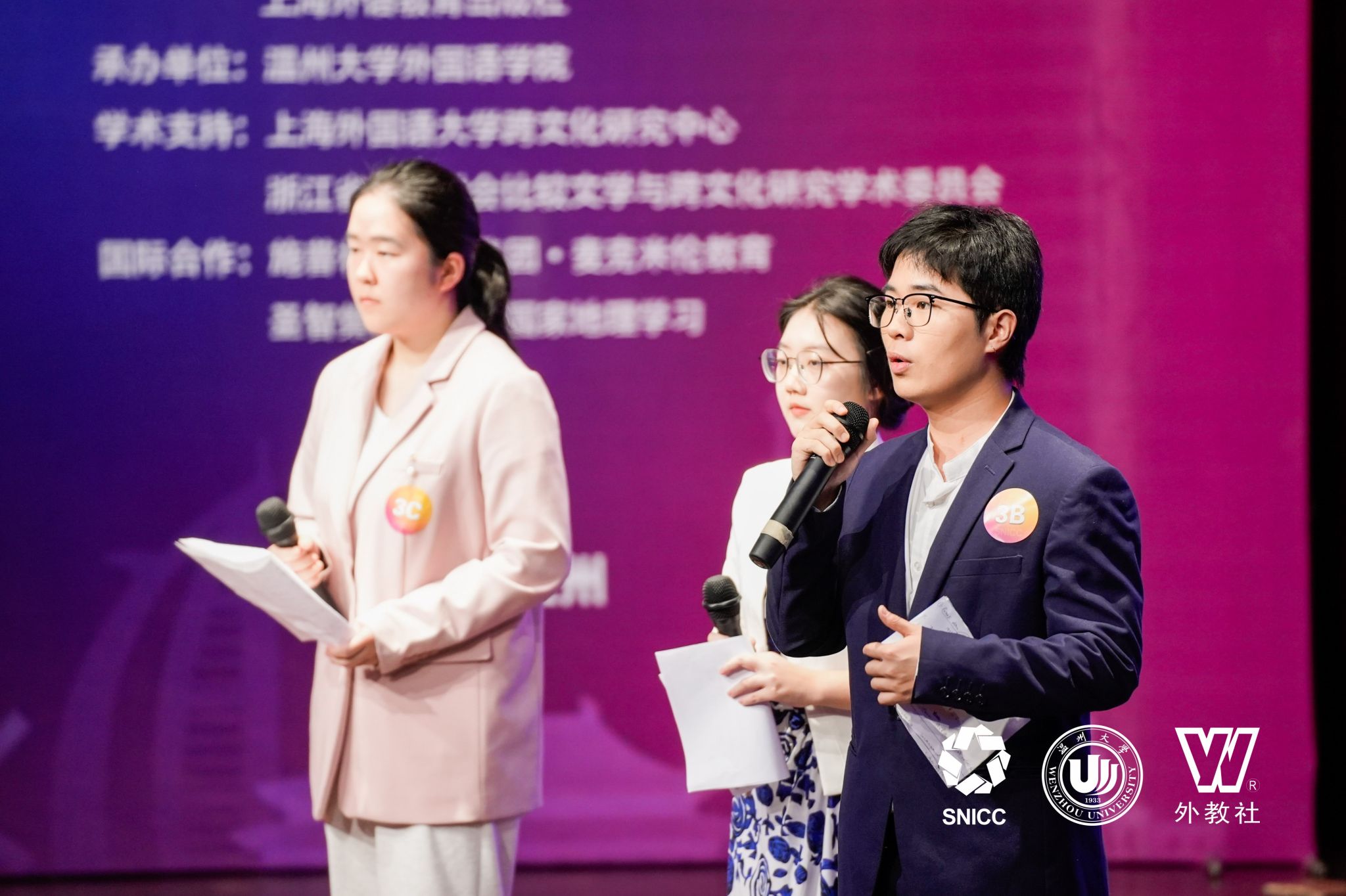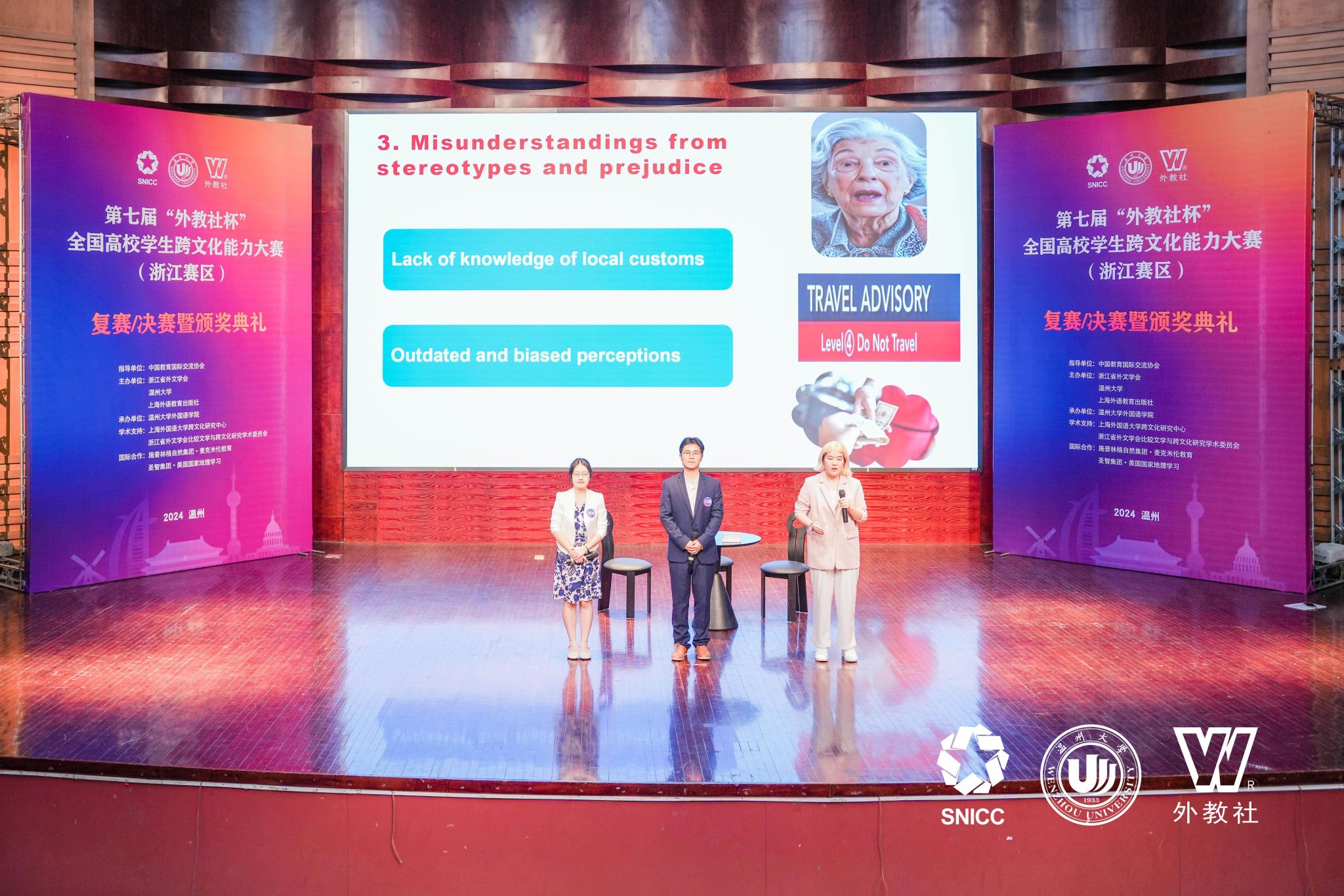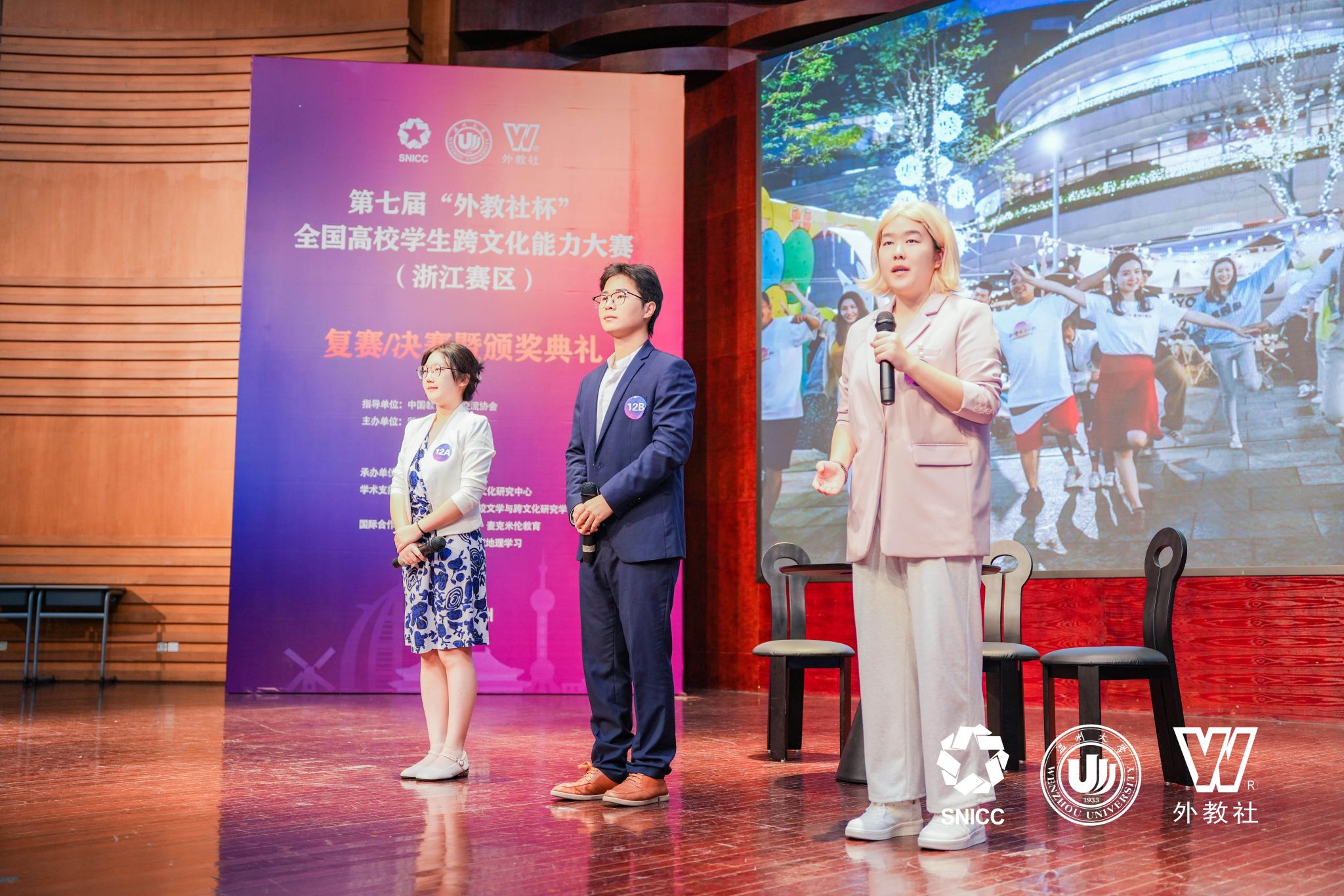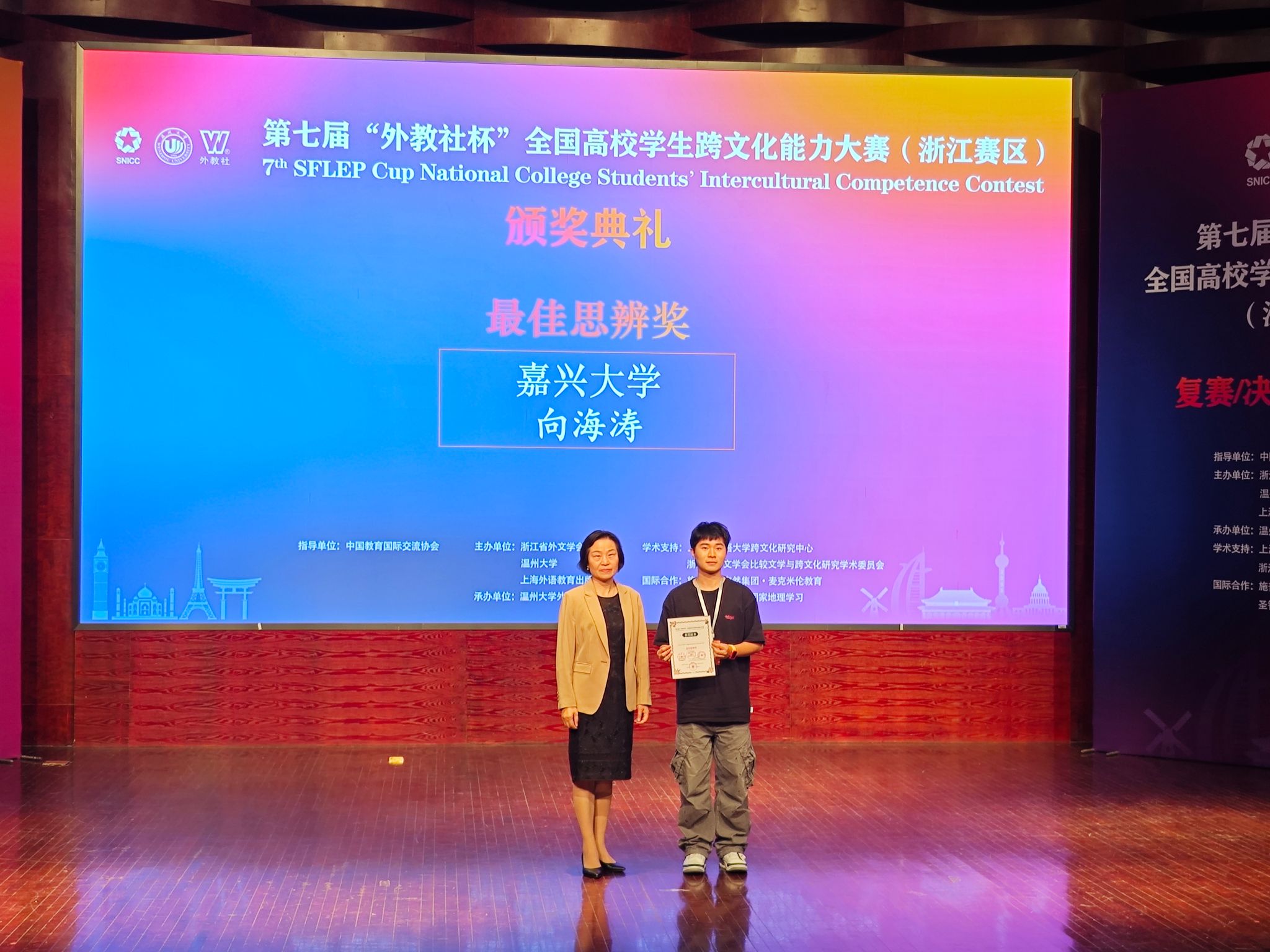 11月16日至17日,第七届“外教社杯”全国高校学生跨文化能力大赛浙江赛区(英文组赛道)在温州大学成功举办,吸引了来自浙江省30所高校的代表队参加。由天堂资源最新在线陶丹玉、罗国华和鲁俊丰老师指导的学生向海涛、项夕雅和周子璇三位选手代表嘉兴大学参赛获得省级一等奖,其中向海涛同学获得“最佳思辨奖”。这是我校学生在该项赛事获奖上取得的新突破。