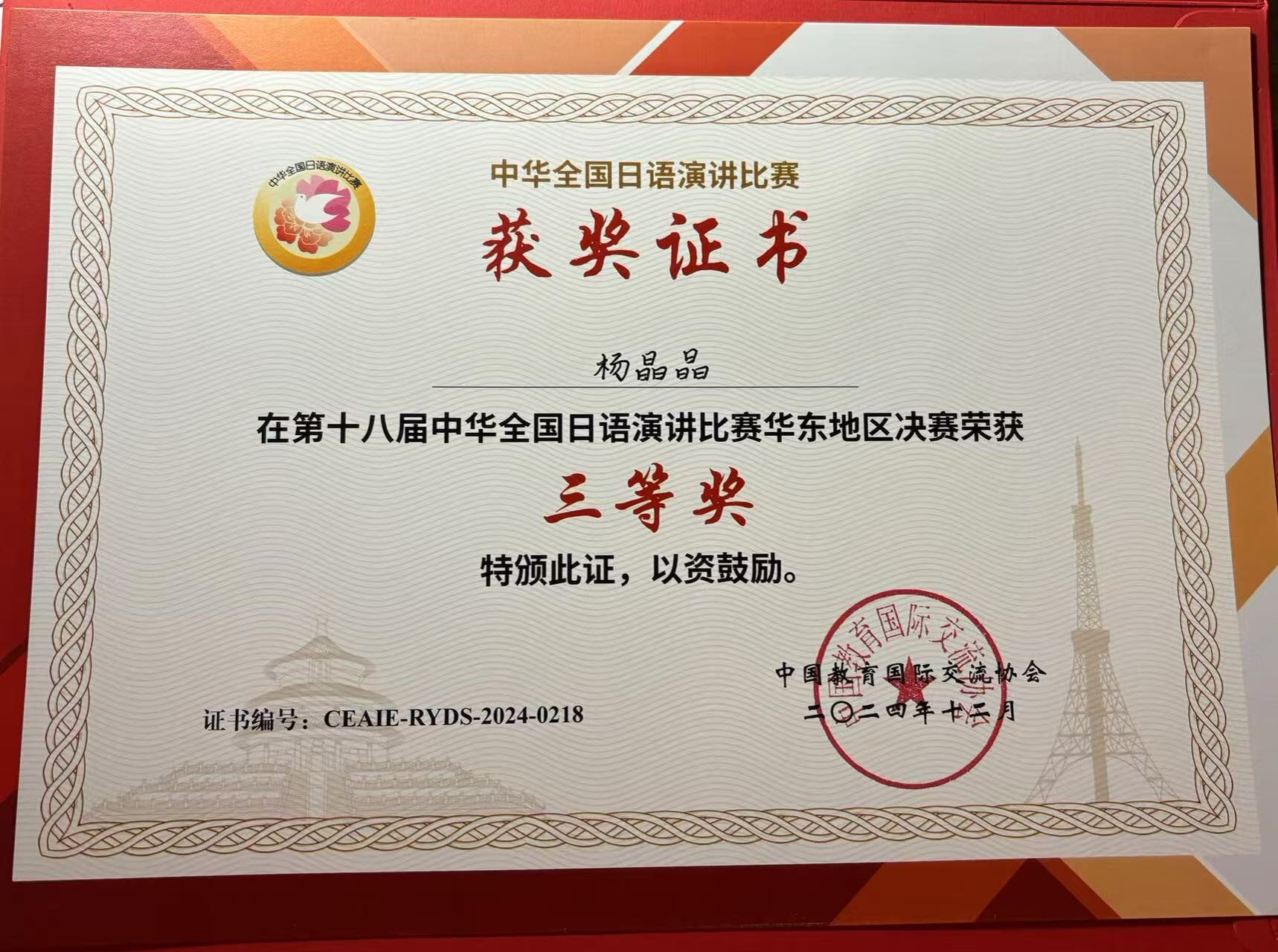 12月8日,第十八届中华全国日语演讲比赛(华东赛区)决赛在浙江工商大学落下帷幕,我校日语专业学子杨晶晶同学表现出色,荣获三等奖。