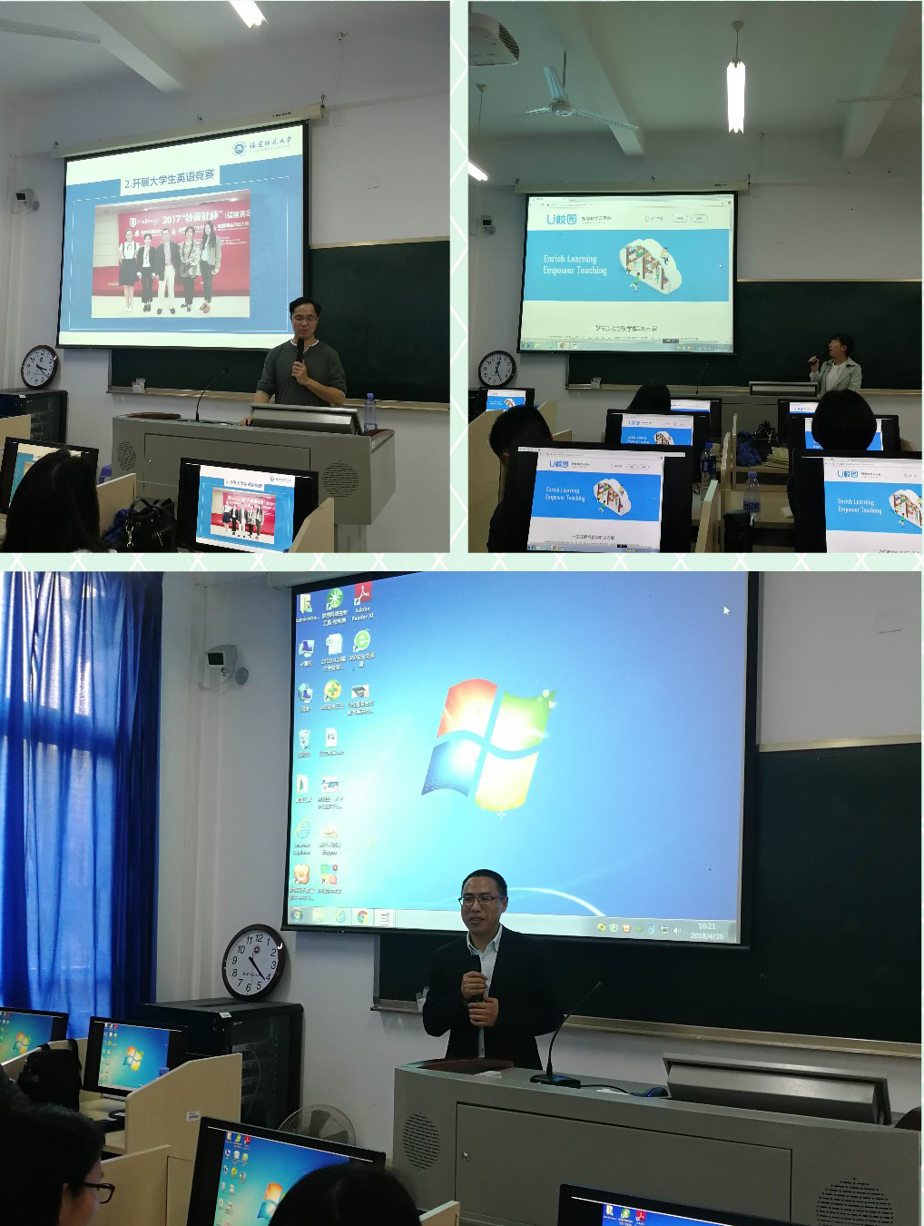 在林明金教授报告之后,外研社技术人员详细介绍了“iTEST大学外语测试与训练系统4.0”以及“U校园智慧教学云平台”在外语教学中的应用,重点讲解了系统平台的特点,使用方法和技巧等。