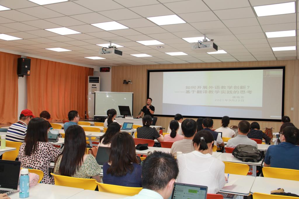唐艳芳院长近年来一直讲授英语专业《翻译理论与实践》《英汉互译》《高级笔译》等多门课程,在本次沙龙上结合切身的翻译教学实践,就如何开展外语教学创新分享了自己的心得体会。唐院长首先谈到创新的概念与本质,认为教学创新不能仅局限于教学形式和手段,更重要的是教学理念和内涵的创新。创新是手段而非目的,老师们在寻求教学创新的过程中始终要坚持以创新为手段来达到提高教学质量的目的。虽然学生群体在变化,学习的资源和渠道在变化,教学技术和工具在变化,但对学生全方位关怀的初心是不变的,对学生能力的提高和发展的终极目标是不变的。在谈到如何进行教学创新时,唐院长总结了三点。第一,教学内容创新---唯变不变。作为教师要时刻做到识变、应变、求变,即要看到变化的趋势,从被动应变到主动求变,这也是未来外语教育教学的必经之路。第二,教学形式创新---让学生参与。无论在课堂还是课后,教师要始终保持与学生的良性互动,把学生所思、所想、所说记录下来。这不仅是对学生成就的关注和肯定,同时也是重要的教学反思过程。第三,外语教学创新中教师形象的树立。教育不是传授知识本身,而是教会学生学习的方法。教师是文化的摆渡者,是激发学生灵感和热情的人。同时,教师又是学习者,要保持不断的学习状态,做到与时俱进。创新是永无止境的,学习是终身使命。老师们要做到大道至简、道器合一,以心启心、教学相长。