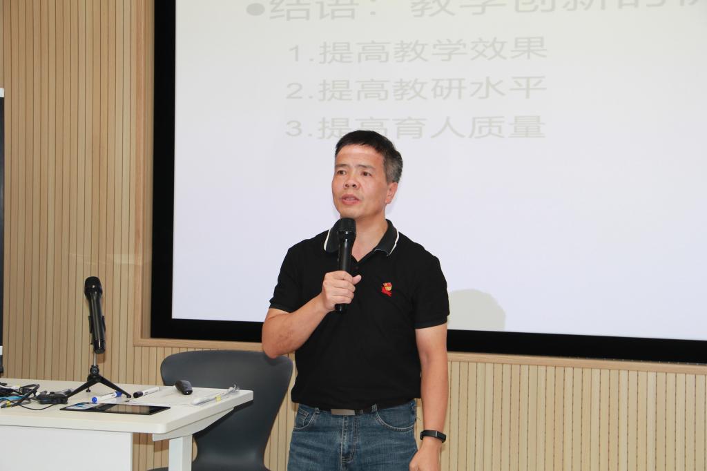 接着,喻锋平副院长就“教学创新的价值”分享了自己的经验和体会。他认为教学创新的原动力来自三个方面。第一,培养学生在未来具备应对工作场景和能力需求变化的能力;第二,科技发展对于教师和大学的知识垄断地位的冲击;第三,越来越复杂多元的学生群体个性化的学习体验。因此,教学创新要牢牢把握好三个基本标准,即“两性一度”:高阶性、创新性、挑战性。创新教育的关键在课堂,教学创新的关键也在课堂。因此,教师要努力实现人本化的课堂教学、创新课堂互动,即所有教学活动的设计和创新都要围绕学生的发展为目标。实现辩证化的课堂教学、辩证处理矛盾,即辩证处理课堂中形式与内容、传统教学和现代教学等的矛盾。实现思辨性的课堂教学、引导启发激励,即真正的课堂教学创新在于课堂内容能启发学生,从而更好的引导和激励学生。喻院长通过分享了个人教学创新案例——2016年省教改项目“项目化(PBL)翻译教学”的教学经验,挖掘了教学、吸收、应用、成效四个环节,认为用创新体现教学研究的价值应体现在经验总结、案例反思和教研工具三个方面。同时强调,万变不离其宗,不论哪一种教学方法都是外在的,而促进学生的全面发展才是重心和目的。教学创新要面向学生未来的发展需求和学习需求,以及面向未来的教育发展的趋势。教学创新的价值在于:教学创新能提高教学效果、教研水平、育人质量。