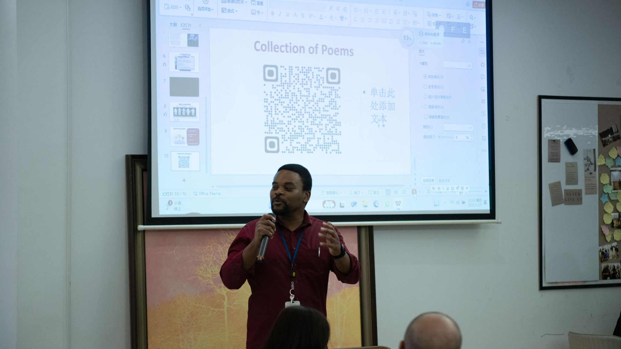 收官之时,同学与老师们热情地分享着自己创作的诗赋,并选出了最受欢迎的几位“诗人”。本次精彩活动在外教Kay的总结声中圆满落幕,不仅为同学们提供了展现语言艺术魅力的舞台,还搭建起中西诗学对话的桥梁。虽然活动已落下帷幕,但同学们的诗性不止,余韵绕心,相信诗歌的力量能化作他们进步的催化剂。