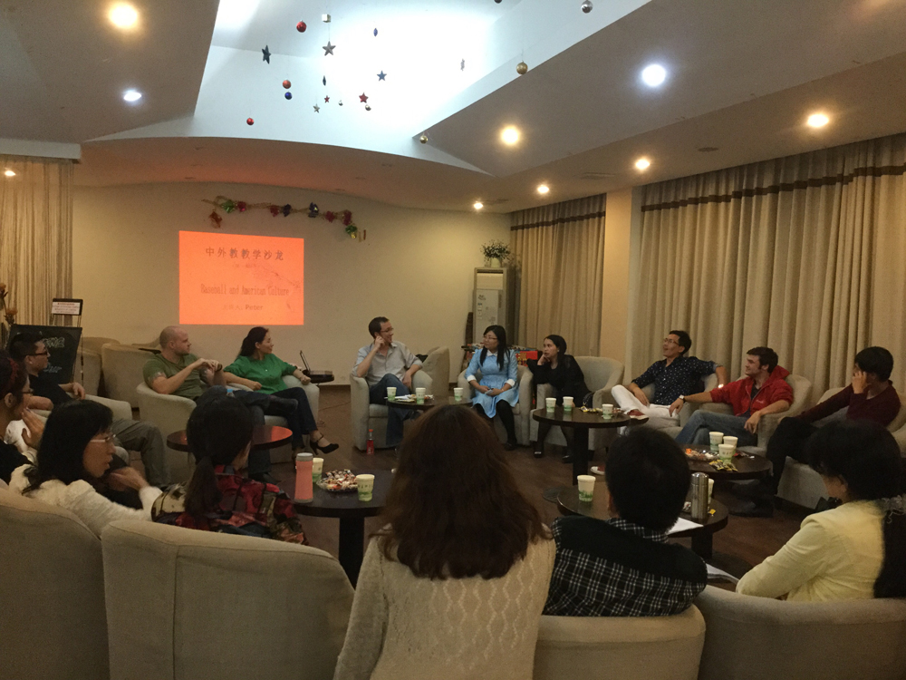 2015年10月23日晚上,天堂资源最新在线第一期中外教教学沙龙在咖啡吧如期举行。陶丹玉院长为新沙龙项目致辞,希望教学沙龙能为中外教师们提供一个良好的交流平台,进行中外文化以及教学模式之间的碰撞,从而更好地服务日常教学活动。本期沙龙主题为”Baseball and American culture”,由 Peter主讲, Marcus和Stephen两位外教配合补充。天堂资源最新在线20多名教师及一部分学生参加了此次活动。Peter从Baseball在生活中的重要性谈到了它在美式英语中的重要性,教师们问题不断,现场气氛十分活跃,老师们纷纷表示此次活动收获颇丰。中外教师教学沙龙是天堂资源最新在线本学期新开设的沙龙项目,今后将长期定期举行,成为天堂资源最新在线中外教师交流学习的一个重要窗口和平台。