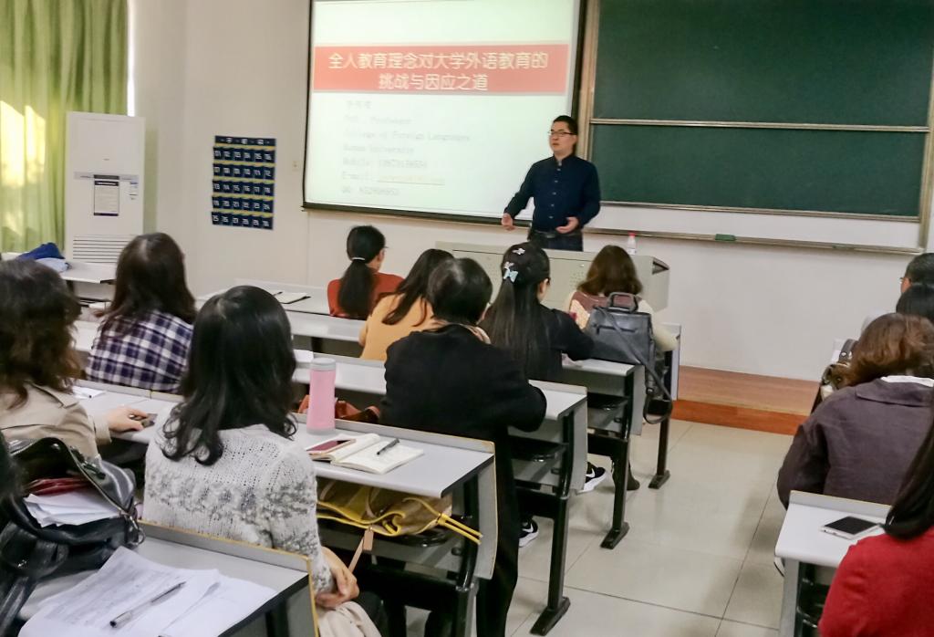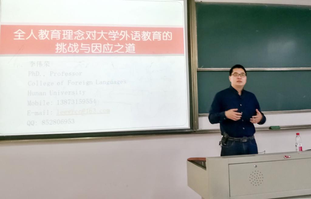 2017年11月2日下午,应天堂资源最新在线邀请,湖南大学天堂资源最新在线李伟荣教授在教二B 217作了一场题为《全人教育理念对大学外语教育的挑战及其因应之道》的学术报告。报告会由唐艳芳院长主持,英语系和大外部教师到场听取了本次讲座。