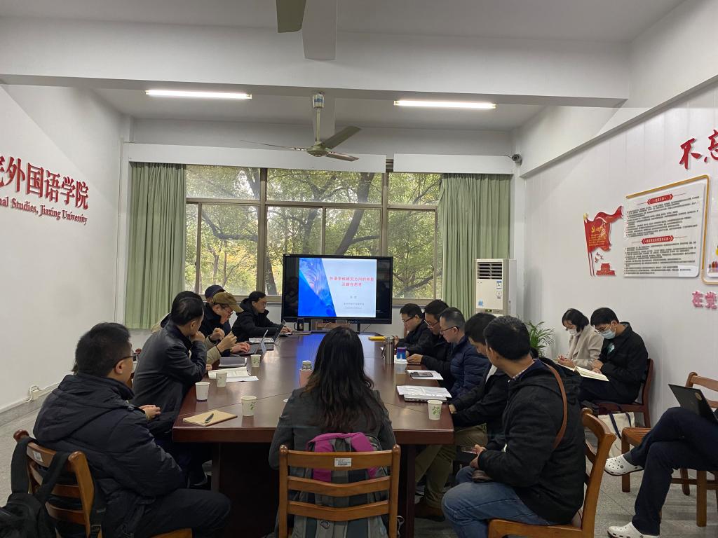 肖博士从外语学科方向变化新特点、研究方向转型大背景、研究方向转型路径、浙江(嘉兴)中外政党研究中心简介四个方面讲述了外语学科研究方向转型及路径思考。他首先讲到,近年来外语学科呈现出学科方向新调整、人才培养新定位、科学研究新领域、服务社会及国际交流合作新亮点等变化,具体表现在:打破学科界限,强调学科融合;突出跨学科高层次创新人才培养,强调学科融通能力;聚焦学术话语体系,凸显中国风格;注重智库建设,突出国际传播。其次,外语学科研究方向转型根植于时代发展的大背景,对接国家对外开放发展战略需求,响应教育部全面推进新文科建设号召,契合嘉兴学院建成一流应用型综合大学目标定位,适应教师个人学术基础和今后发展。再次,对于研究方向转型路径,肖博士建议教师个人要积极发挥主观能动性,系统性阅读中国文史哲书籍和相关国家政治、经济、社会、文化和国际关系文献,弥补知识结构短板,提升专业能力水平。同时,学校和学院层面可以通过制定激励政策,有计划、有步骤地对青年教师开展针对性培训,通过搭建跨领域、跨学科、跨国界学术组织,促进外语和其他学科教师的科研协作。