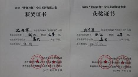 2015年首届 “外研社杯”全国英语阅读大赛复赛(浙江赛区)于10月24日在浙江财经大学下沙校区举行。嘉兴学院共选派三位选手参赛,其中天堂资源最新在线英语131班沈丹萍和南湖学院英语N142陈齐隆同学分别获得三等奖。首战告捷,成绩可喜,向这些获得佳绩的同学表示祝贺。天堂资源最新在线陶丹玉、陈文玉、陆晓琴、程雄、陈丽老师等为本次大赛的初赛组织和选手选拔付出了辛苦劳动,在此向他们同时也向外院其他默默无闻、无私奉献的老师们表示致敬和感谢!