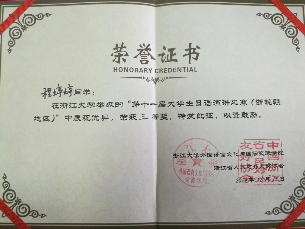 去年,我院日语专业学子曾获过省内日语演讲大赛的三等奖(徐欢)和二等奖(朱逸琳),这是我院日语专业连续两年再次斩获该赛大奖。