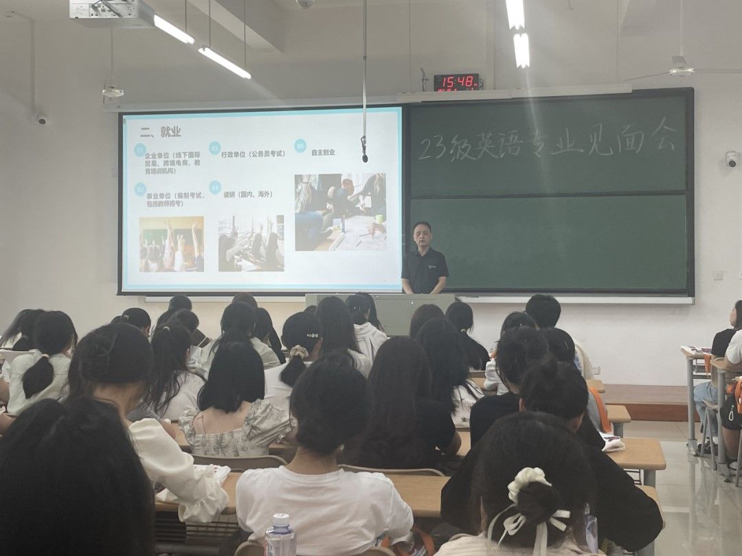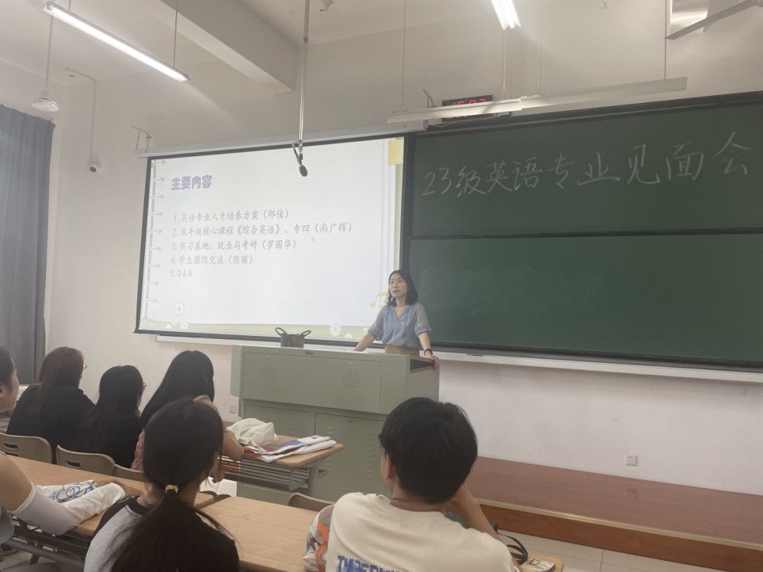 又是一年开学季,正是橙黄橘绿时。美丽的嘉院迎来了90位来自祖国四面八方的英语专业新生。他们怀揣梦想,带着憧憬,走进天堂资源最新在线,开启了新的人生之旅。为帮助新生更快适应大学生活,2023年9月10日下午,英语系在兴德楼123举办2023级英语专业新生见面会。会议由英语系主任邱佳博士主持,英语系尚广辉老师、陈丽老师、罗国华老师等出席。他们从人才培养方案、基础英语学习、专业等级考试、实习就业、考研留学等方面与新生做了面对面交流。