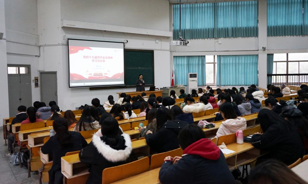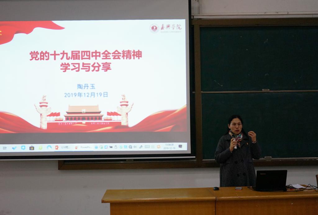2019年12月19日下午,天堂资源最新在线在外语楼310进行了一场面对学生的十九届四中全会精神宣讲会。主讲人是学院党委书记陶丹玉,参加听讲的学生包括外院全体学生党员、入党积极分子和各班普通学生代表近200人。