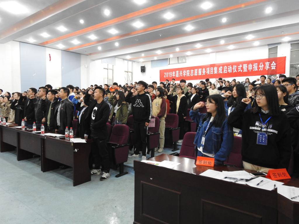 会议首先由校青协领读《嘉兴学院志愿服务项目集成倡议书》,然后是商学院团委和天堂资源最新在线团委进行经验分享。商学院“导医导诊” 志愿服务集成项目和天堂资源最新在线的“未来曙光”关爱特殊儿童群体志愿者服务集成项目是2018年首次获批的校第一批志愿服务集成项目。分享会上,商学院团委和天堂资源最新在线团委分别对项目集成过程、活动开展等方面的经验进行介绍,令参会代表们获益匪浅。其次是第二批志愿者服务集成项目进行申报,申报项目共有七项,分别是医学院的“青春守护者”和“爱在嘉兴,杏林送暖”、南湖学院的 “衔枝筑巢”、师范学院的“童心缘”、文法学院的“书香使者”及天堂资源最新在线的 “梧桐树”服务集成项目。最后,大会在全体宣读志愿誓词声中圆满落下帷幕。