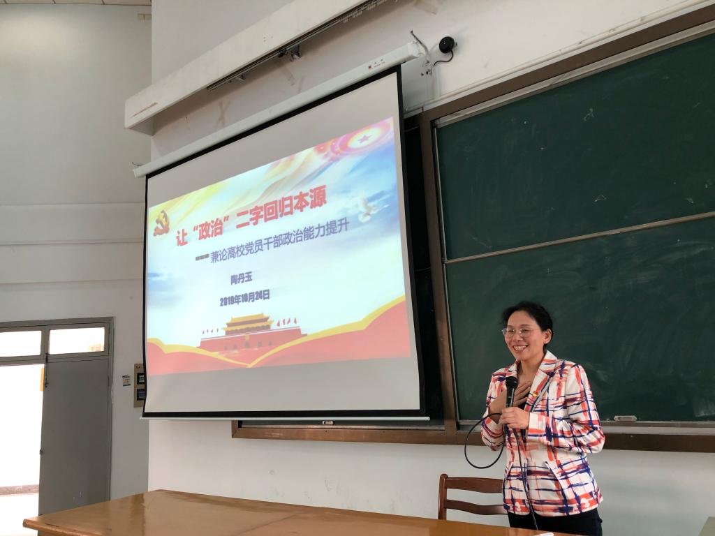 如何提高政治能力?这是摆在广大党员和领导干部面前的现实问题。陶丹玉从以下五个方面提出建议:主动提升理论素养,为党建工作和教书育人实践提供思想指导;向时代楷模学习,锤炼对党忠诚的政治品格;自觉接受党内政治生活熏陶,遵守政治规矩,提升政治意识;结合高校师生特点,研究针对性的思想政治工作方法;用行动践行初心使命是最大的政治担当。她要求全体党员要自觉抵御西方个人主义和自由主义思潮的影响,以及市场经济带来的各种诱惑,树立社会主义核心价值观,培养德智体美劳全面发展的社会主义事业接班人。