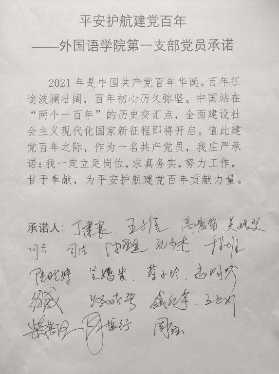 观看完表彰典礼的直播之后,外院教工第一支部还开展了“平安护航建党百年”主题党日活动。百年征途波澜壮阔,百年初心日久弥坚。中国站在“两个一百年”的历史交汇点,全面建设社会主义现代化国家新征程即将开启。值此中国共产党成立100周年之际,全体党员签署承诺书,庄严承诺:我一定立足岗位,求真务实,努力工作,甘于奉献,为平安护航中国共产党成立100周年贡献力量。