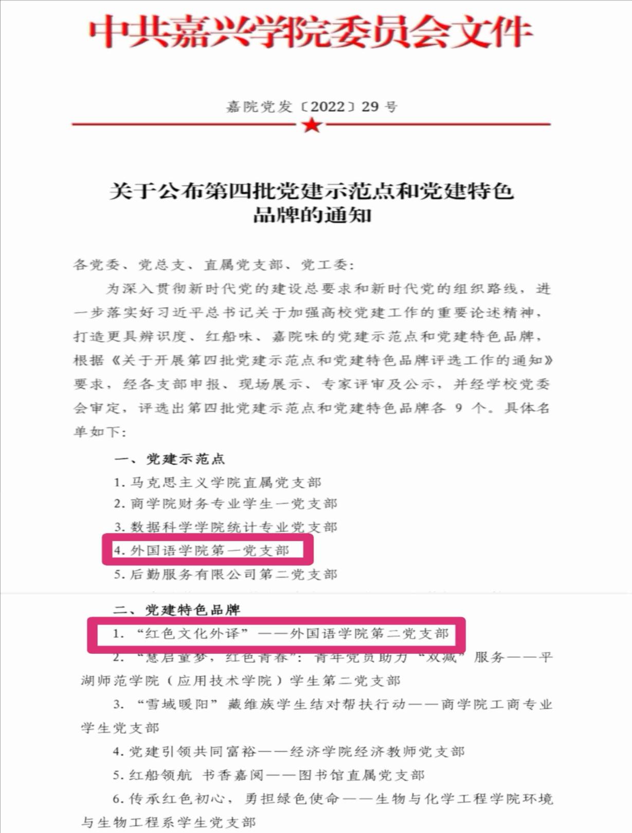 在嘉兴学院2022年10月开展的第四批党建示范点和党建特色品牌评选活动中,天堂资源最新在线两个党支部一齐登上荣誉榜,第一党支部被评为党建示范点,第二党支部位列党建特色品牌榜榜首。