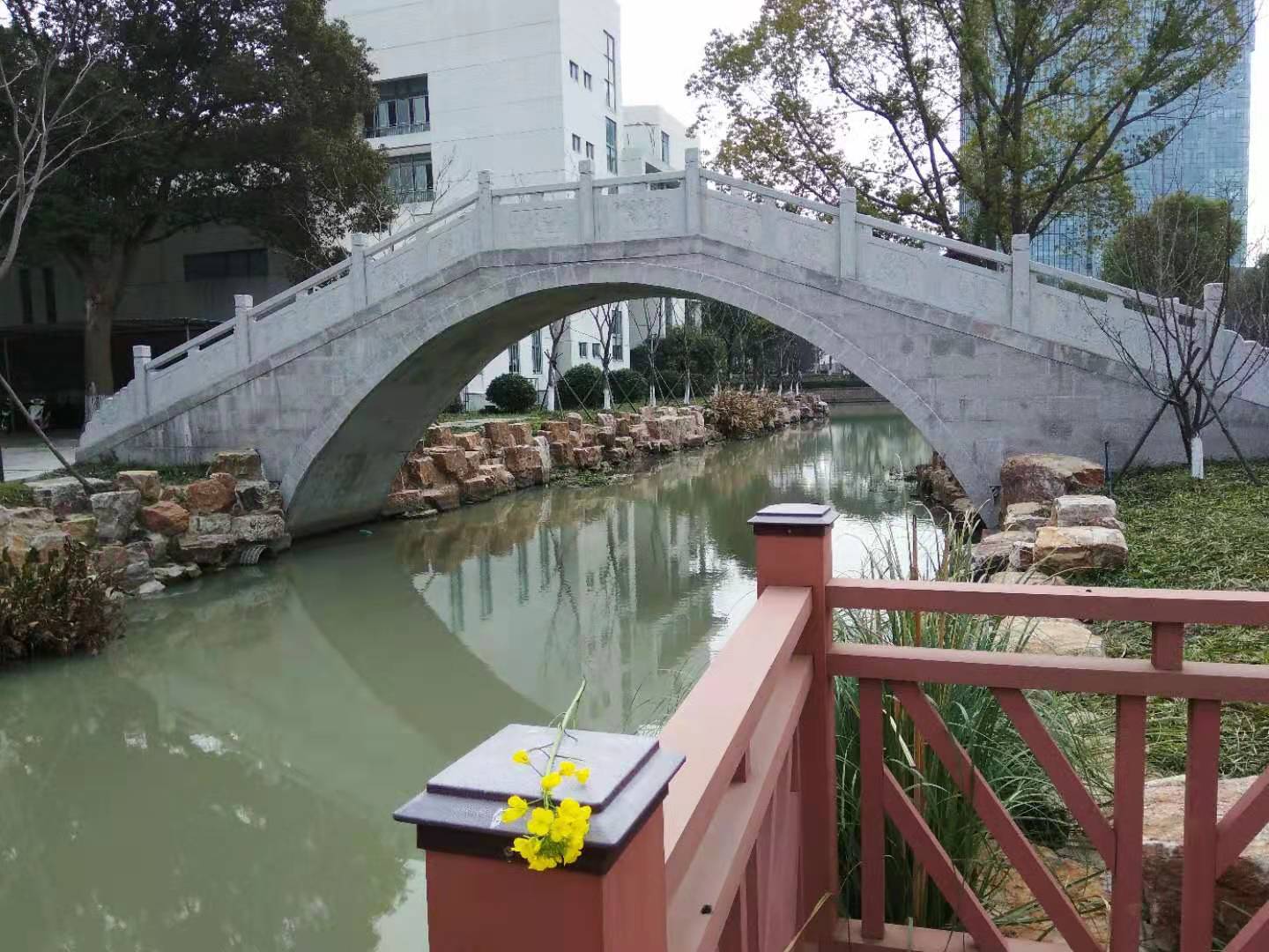 图片1:清晨梁林校园,小巧精致的校园一隅:亭台、水榭、绿树、桃花、倒影,尽收眼底,美不胜收。