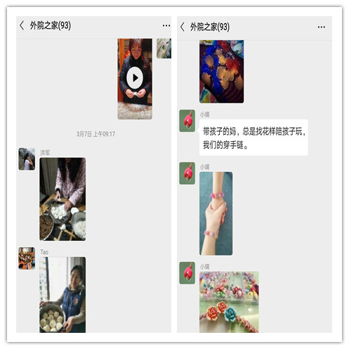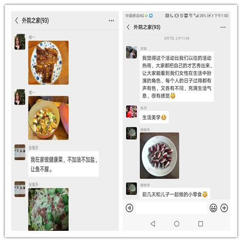 群里越来越情绪高涨,连男士们也兴致勃勃参与进来,大秀特秀自做的包子和与宠物狗抢美食的生动情景。晒着晒着大家不知不觉就PK起来,在互赞互评中把活动推向高潮,期间不乏好奇者的发问和好师者的趣答,因而“挖掘”出图片和视频背后一个个有趣的故事,交流着健康生活的智慧,分享到积极豁达的生活感悟。还穿插着院领导的温馨祝福和男同事的热情鼓励,女神们倍感集体的温暖。