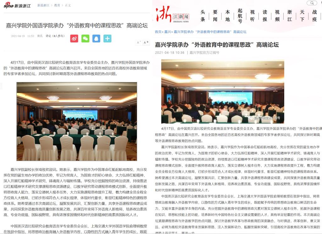 此次高端论坛受到省市级媒体的关注,新浪网、浙江新闻客户端、嘉兴日报、读嘉、嘉兴在线、嘉兴学院报、嘉兴学院微信公众号等多家媒体对此次高端论坛进行了报道。高端论坛的传播力、影响力进一步提升。