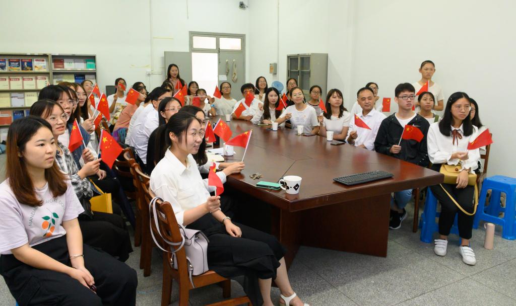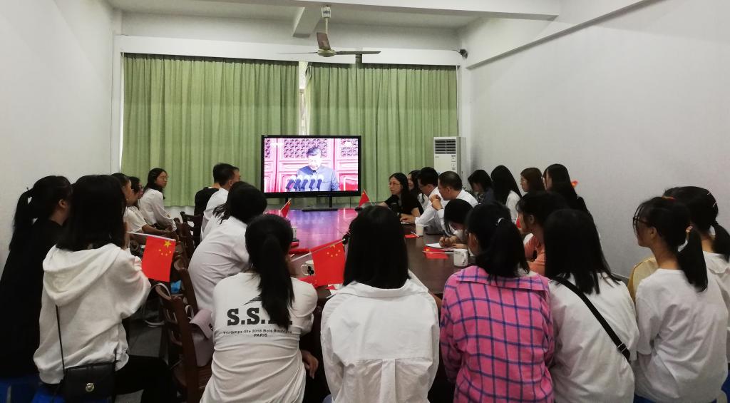 为庆祝新中国成立70周年,天堂资源最新在线响应校党委的号召,组织教师及学生代表于10月1日参加“不忘初心、牢记使命、砥砺前行”主题升国旗仪式,并集中观看了庆祝大会、国庆阅兵式等庆典直播。参加庆祝活动的教师代表由学院党政班子成员、优秀教师代表和青年教师代表共15人组成;学生代表涵盖了英语、日语两个专业四个年级。