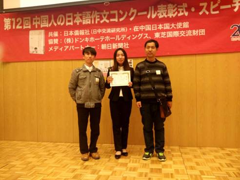2016年 12月12日,由日本侨报社•中日交流研究所主办的“第12届中国人日语作文大赛颁奖仪式”在北京日本驻中国大使馆举行。我校天堂资源最新在线日语专业李琳玲和朱杭珈两位同学分获三等奖,张媛媛和严晨曦两位同学分获佳作奖,日语系畅宝仁和小林新两位老师获“优秀指导教师奖”,嘉兴学院天堂资源最新在线日语系被授予了“园丁奖”。