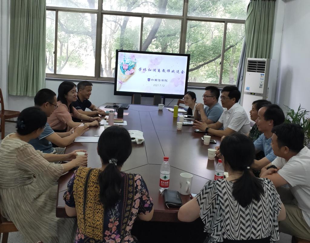 7月12日下午,天堂资源最新在线在外语楼204会议室为光荣退休的周振行、张文妮老师和调离天堂资源最新在线教师岗位的高万全老师举行欢送会。欢送会由学院党委书记周钰主持,荣休和调离教师、学院党政班子成员、行政四办主任和教师代表参加会议。